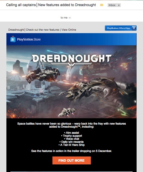 5th December 2016 ECRM - Dreadnought An launch email for a third party title published by Sony Interactive Entertainment Europe.
